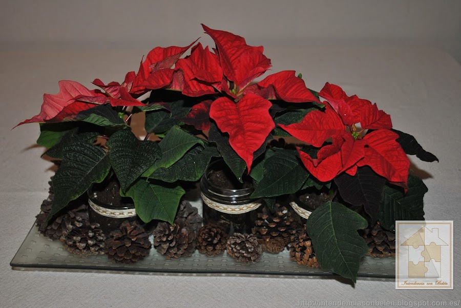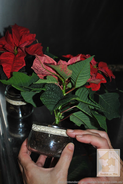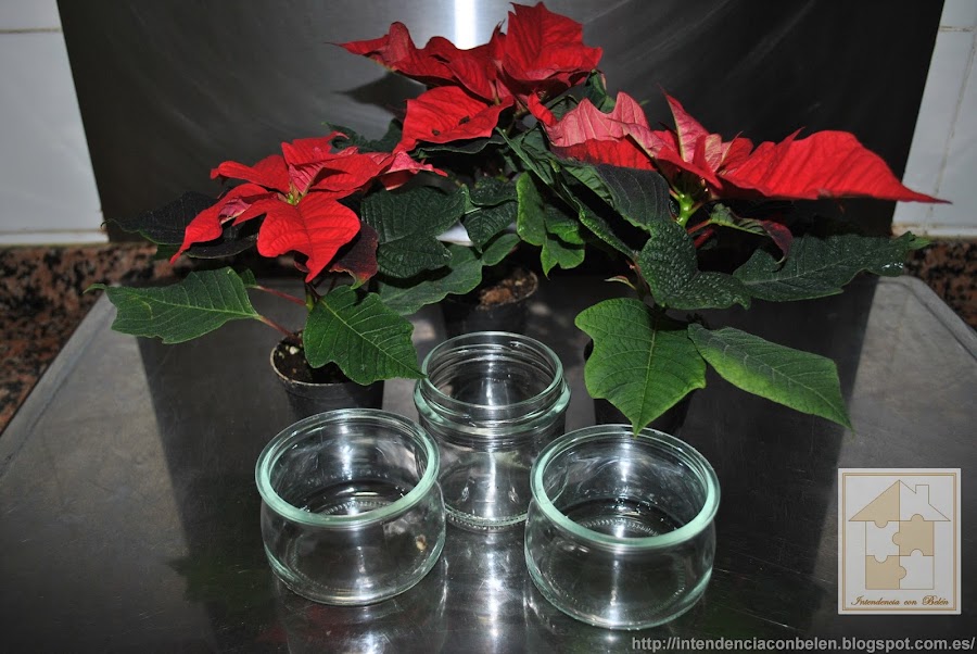 Sólo necesitaréis unos frascos de cristal. Yo tenía unos frascos de yogur y otros de paté y me han venido genial para ésta ocasión. Es cierto que cuando acaben las fiestas tendré que trasplantarlas, porque en éstos tiestos improvisados, la planta no respira y no drena, pero si se la riega a cuentagotas y se la mantiene fuera de fuentes calor, puede aguantaros las fiestas.