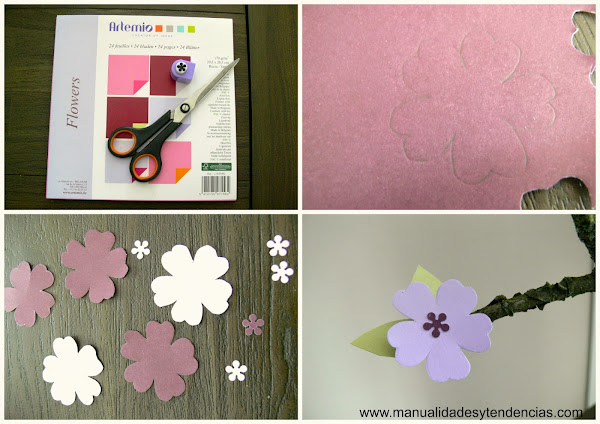 Ahora sólo queda pegar las flores y hojas de cartulina a la rama usando para ello la pistola de pegamento.