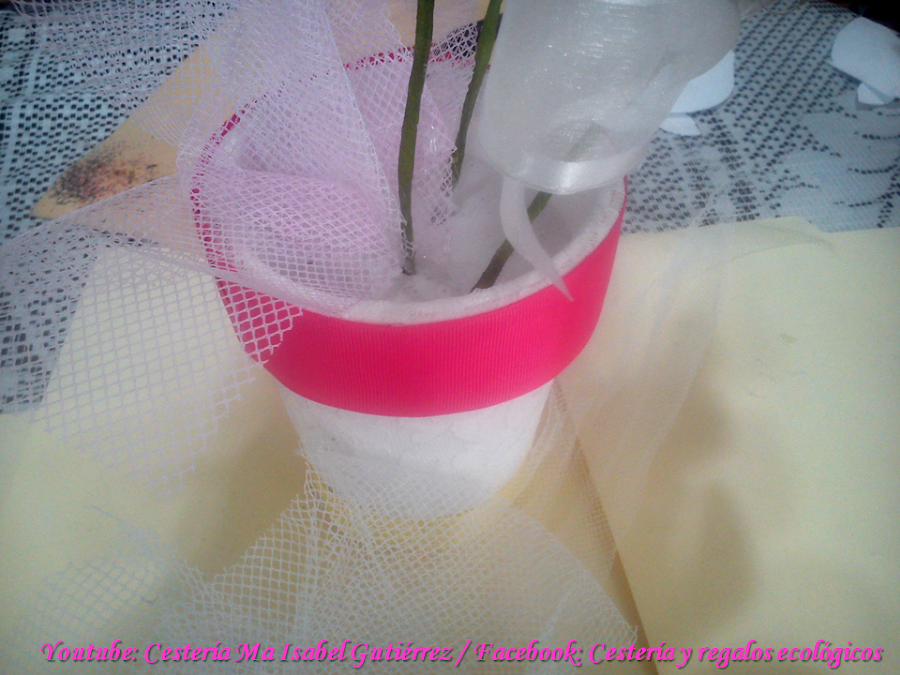 Como decoración y para que no se vea el yeso, ponemos unos retazos pequeños de tul y pegamos listones en el vaso...