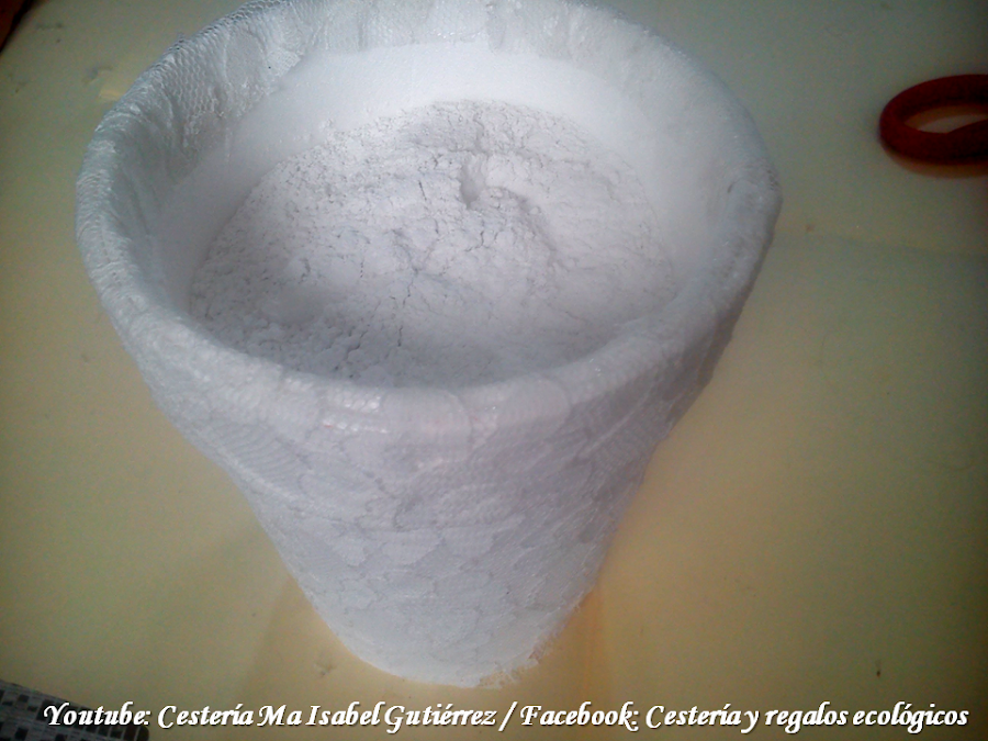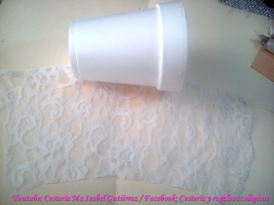 Aparte, usamos una lata o un vaso de unicel o telgopor como maceta, el cual vamos a decorar forrando con encaje o con alguna tela bonita que combine con el color de las flores...