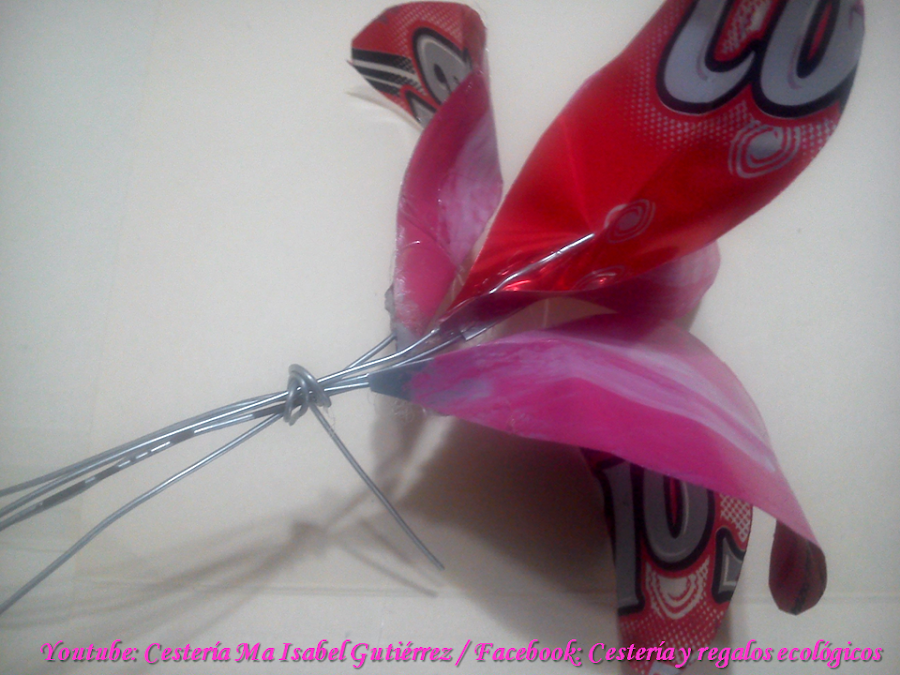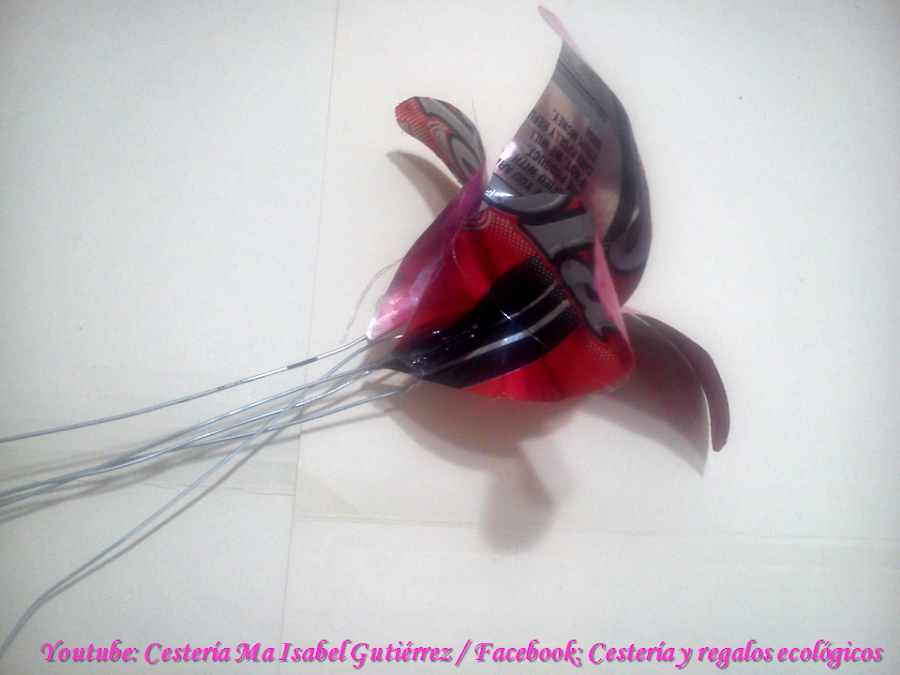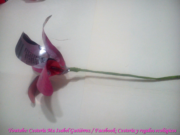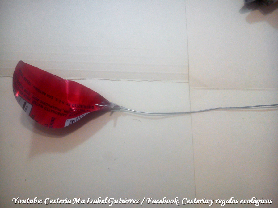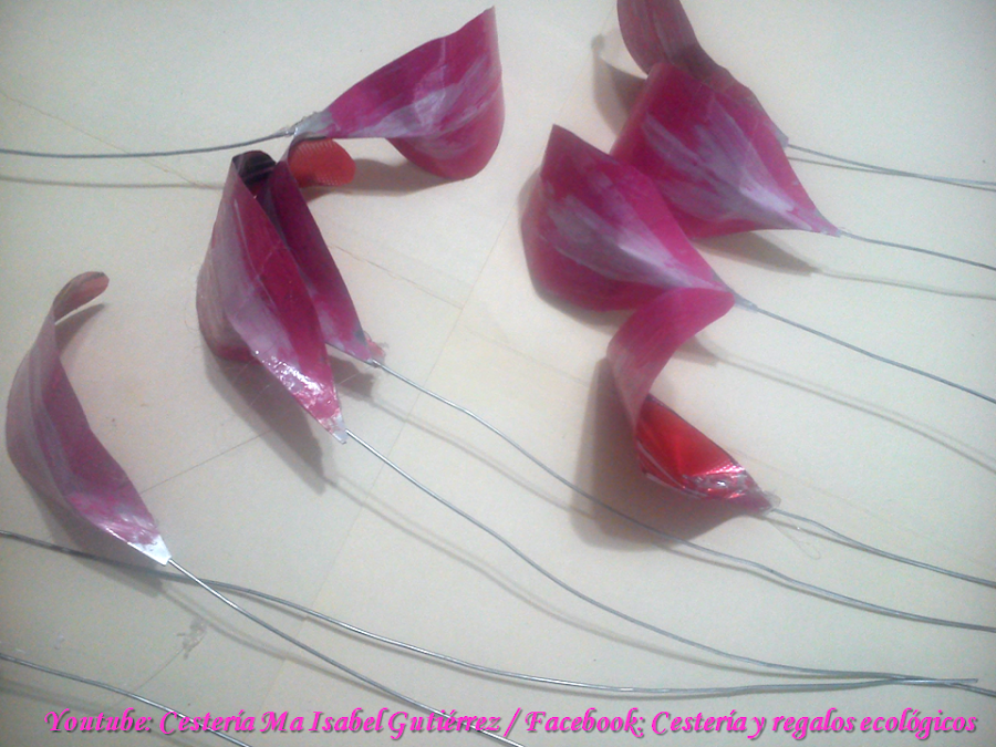 Aparte, cortamos tramos de alambre delgado de aproximadamente 20 cms., de largo, pegamos con silicón un alambre a cada pétalo por la parte trasera, doblando por la mitad el pétalo para que queden bien adheridos al aluminio...