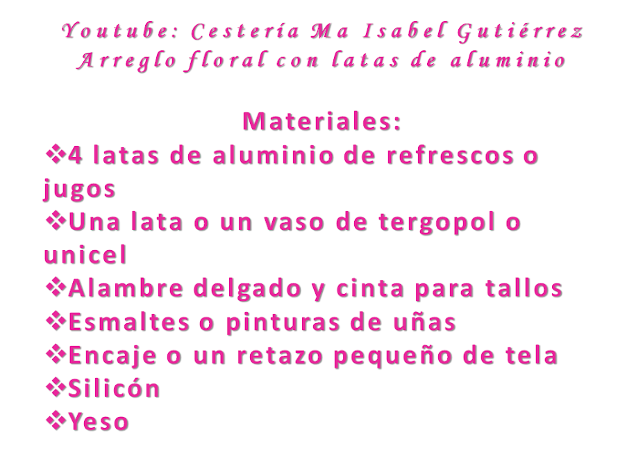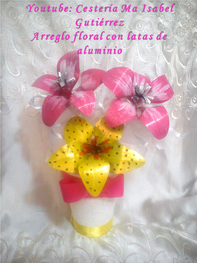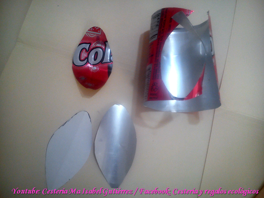 Cortamos el fondo y la parte de arriba de las latas, hacemos un molde de papel de pétalos un tanto alargados y en base al molde, cortamos en aluminio tantos pétalos como flores deseamos, considerando que cada flor está formada por cinco pétalos, la medida de cada pétalo depende de cuan grande desees la flores, en mi caso, tienen 8 cms., de largo...