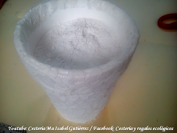 Ya que hemos forrado el vaso, con mucho cuidado, rellenamos con yeso y agua, mezclamos bien, y cuando el yeso esté aún suave, introducimos las flores...