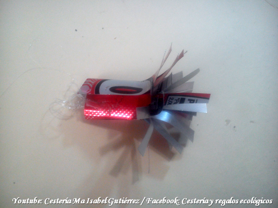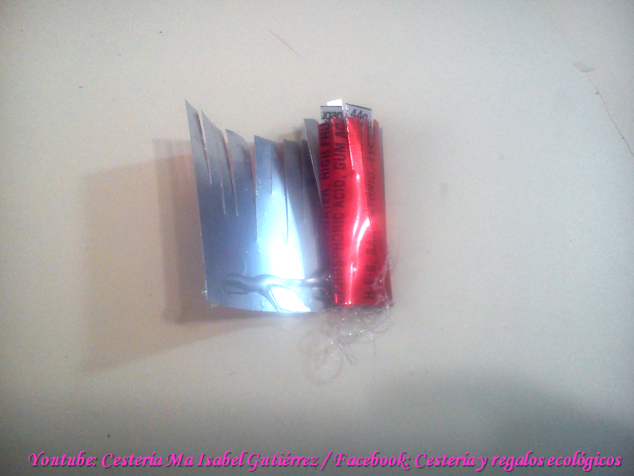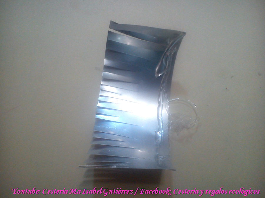 Aparte, cortamos una tira de aluminio de aproximadamente 8 cms., de largo por 3 cms, de ancho, cortamos en tiritas por una orilla, ponemos silicón por la otra orilla...