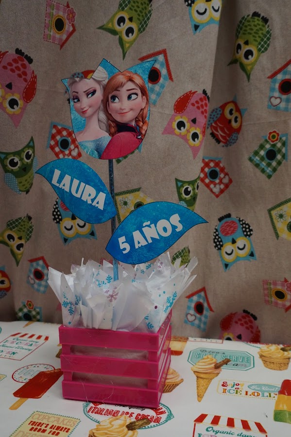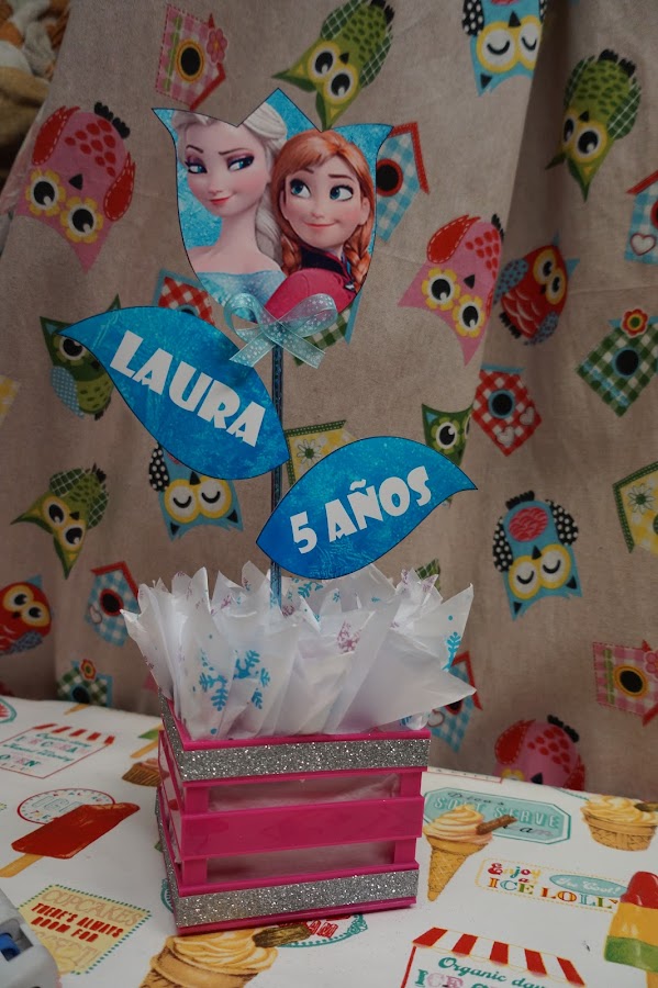 Este lo puedes traspolar a cualquier otra temática como, ya que la imagen de frozen es sacada de internet, impresa e papel fotográfico, por lo que conseguir cualquier imagen para tu centro de mesa, te resultará muy fácil de buscar.