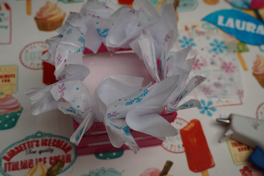 Pegaremos el papel china decorativo ya cortado en cuadros de aprox, 12 x12 cm, los aremos cucurucho y pegaremos en las esquinas del huacal para posteriormente colocar otros papelitos de color normal entre ellos. hasta cubrir toda la orilla del huacal