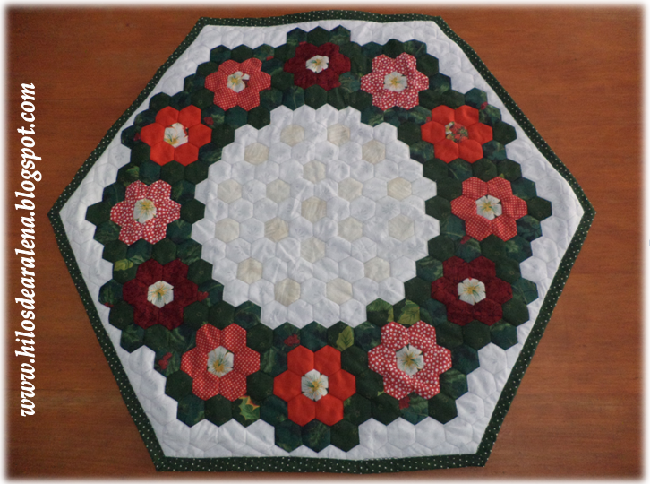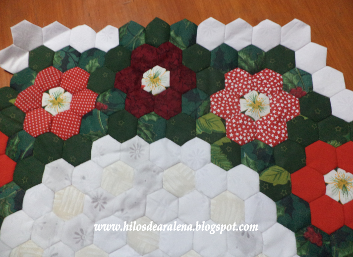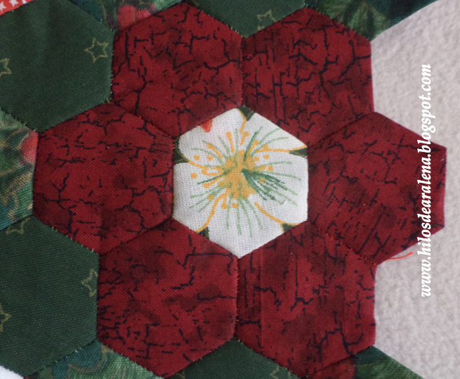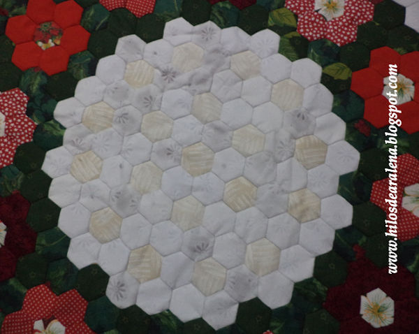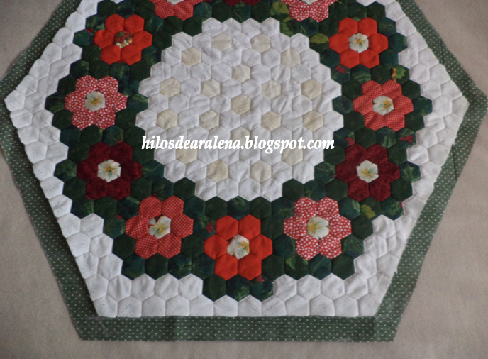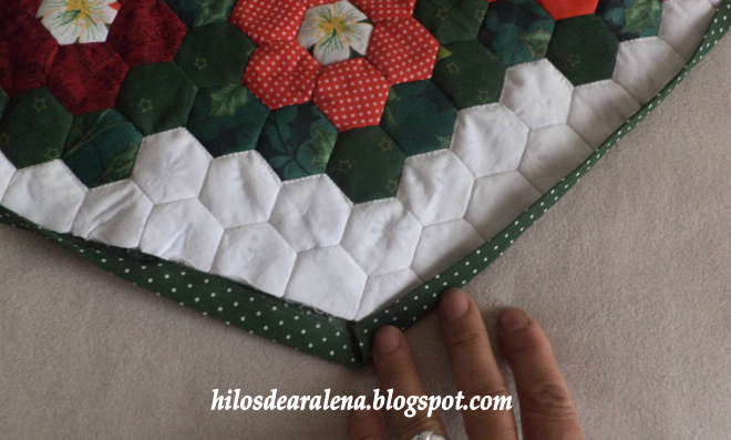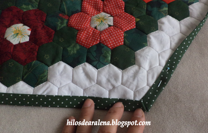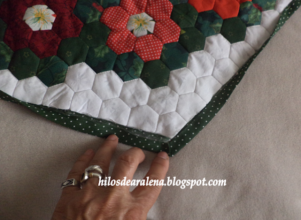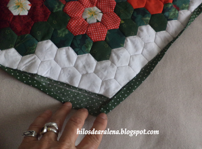 Luego un segundo doblez que se volcaría sobre los hexágonos del tapete y sobre el que se realiza un pespunte de terminación.