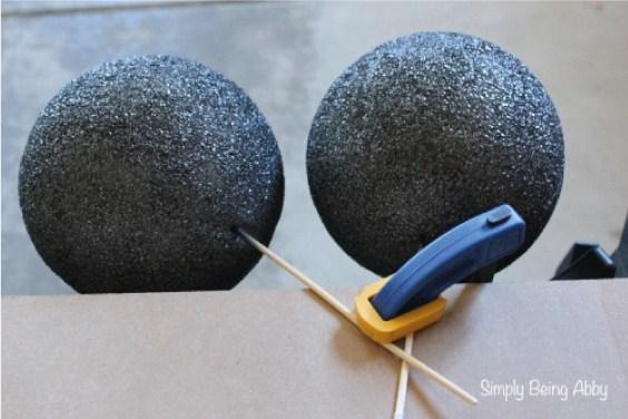 Colocar los palitos de brochette cortados a la medida que necesites, en las esferas pequeñas y ubicarlas en el lugar de las orejas.