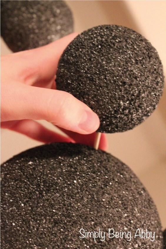 TIP: Si no conseguís pintura en aerosol al agua, podés pintar la esfera con pintura acrílica negra. Luego le colocás una capa de plasticola y espolvoreás con glitter negro.