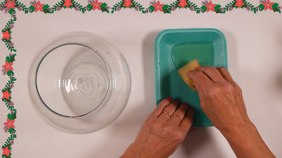 Colocamos el Barniz en una bandejita y con una esponja lo pasamos por la mitad del recipiente hacia arriba.