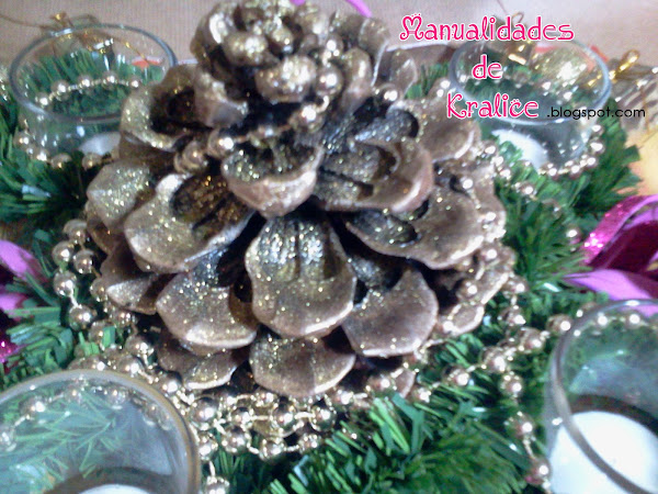 Para empezar con las fotos os dejo las de las piñas la grande como he dicho en el video me la encontré en un parque, la limpie y la pinte con pintura de purpurina y la barnice para que tuviera más brillo.