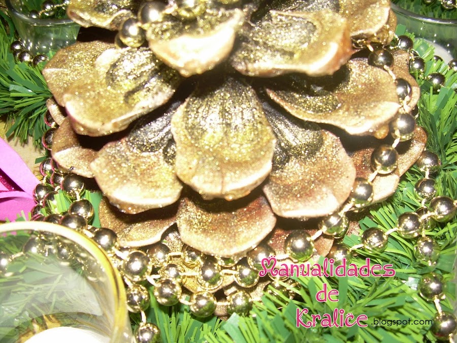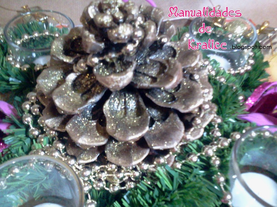 Las piñas pequeñas las compre en un bazar, estaban pintadas de blanco y las pinte también de dorado pero estas no las barnice