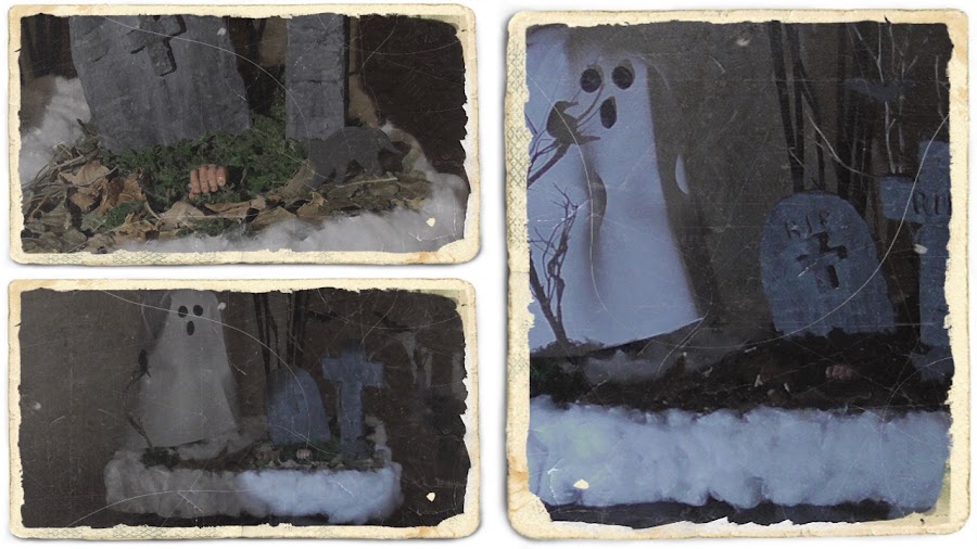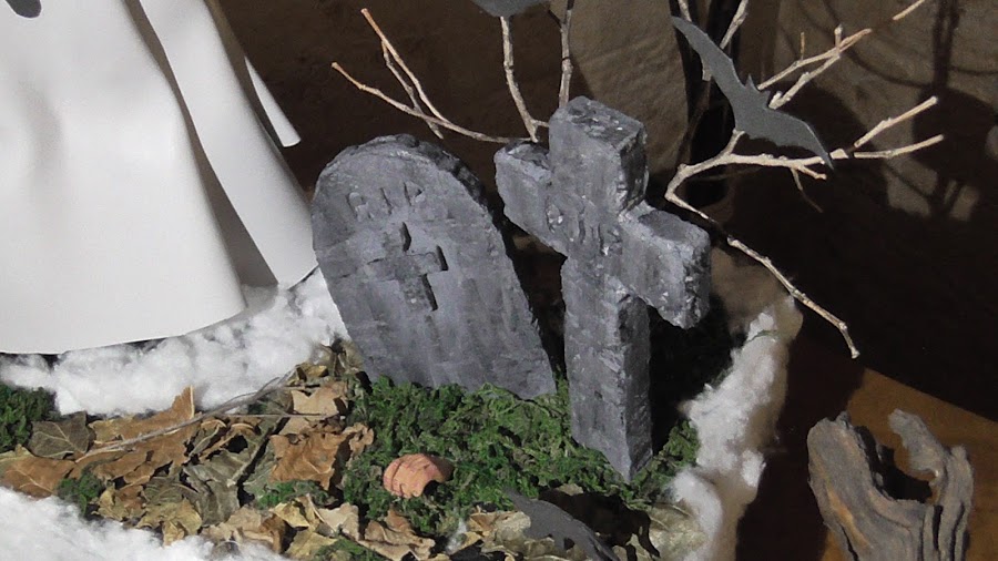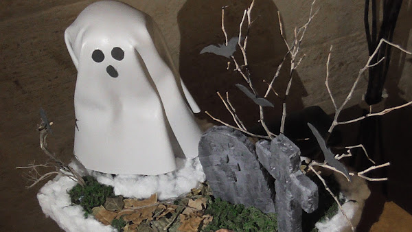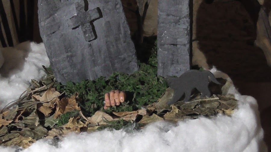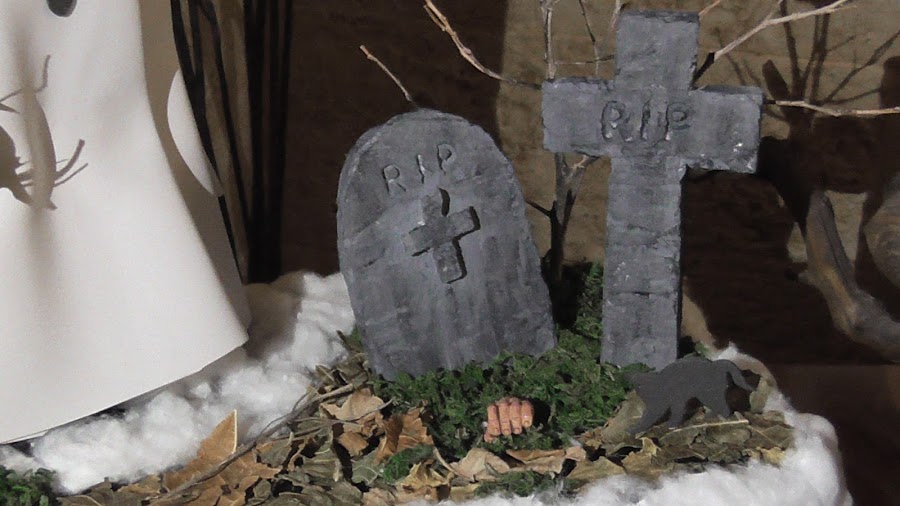 Es muy sencillo y consiste en aprovechar diferentes cosas que tengas por casa. En mi caso la base es la tapa de una caja de zapatos, el fantasma lo he hecho de goma eva (me ha quedado un poco cabezón pero imagino que habrán fantasmas de todo tipo jajaja), las lápidas con corcho retocado con el calor de un soldador eléctrico, de esos para hacer soldaduras de estaño. Luego vienen los detalles: algodón para simular una niebla, unas ramas secas para esos tenebrosos árboles, musgo y hojas secas para el suelo. De internet saque unas figuras para recortar tales como un cuervo, un gato asustado, murciélagos (aquí podéis dejar volar vuestra imaginación). El toque final ha sido una mano que quiere salir de la tierra como la de un muerto viviente retornando a al mundo de los vivos jajaja. Se la he quitado a un muñeco de juguete.