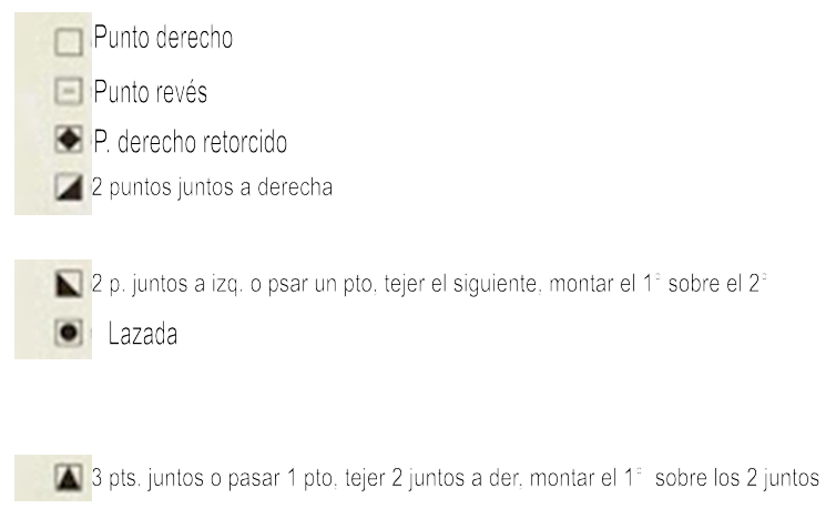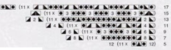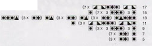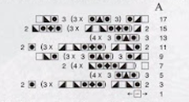 Poner 27 puntos y tejer según el esquema gráfico A ( abajo), repitiendo desde la vuelta 3° a 10° , 28 veces antes de terminarlo en la vuelta 17°