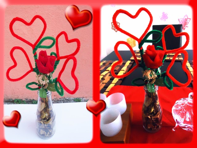 Bueno como todos sabemos estamos con las celebración de San valentín y hoy les traigo un centro de mesa o florero de corazones hecho de limpia pipa muy económico, fácil de realizar y con pocos materiales los cuales tienes al alcance de sus manos, y como ven no solo para ese día lo pueden utilizar ya que tiene un aspecto muy decorativo o incluso lo puedes regalar a una persona especial, la verdad es que le podemos sacar mucho provecho solo dale un lugar cito en tu corazón.