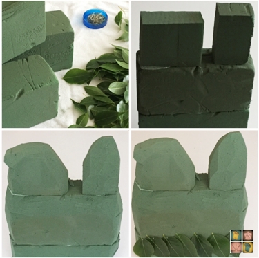 De uno de los bloques de espuma de floristería corta dos piezas, para la cabeza y la cola; Del de la cola cortarlo un poco más pequeño. Pegar los bloques que tienes enteros y los dos que hemos cortado con pegamento (he hecho el paso a paso en fotos), con un cuchillo o cúter ir dando forma de gallina a la espuma.