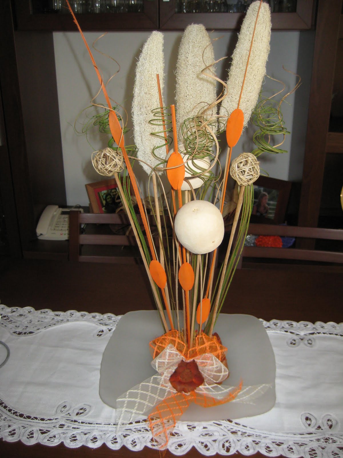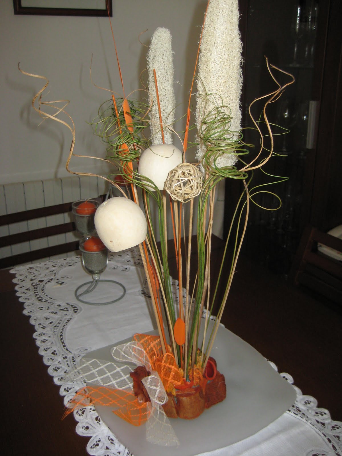Este centro de mesa lo he hecho reciclando algunos adornos que tenía por casa