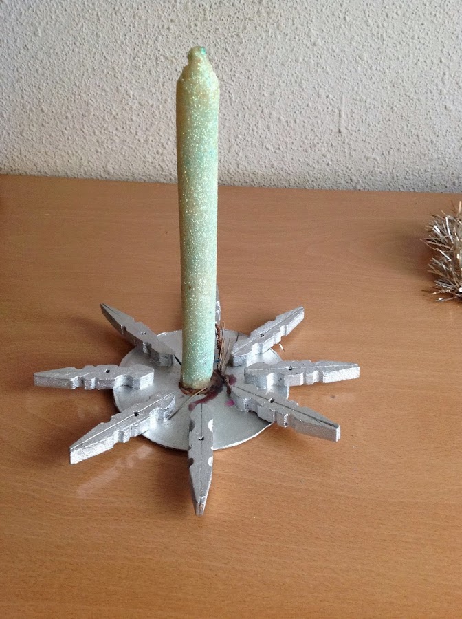 5. Pegar con cola el espumillón en el borde de la base (o en la pinza) e ir dándole vueltas por las pinzas: por encima - por debajo - por encima... hasta que se acabe el espumillón. Esconder la punta o pegarla en algún sitio discreto