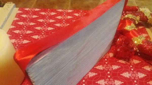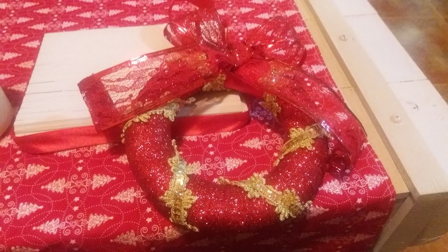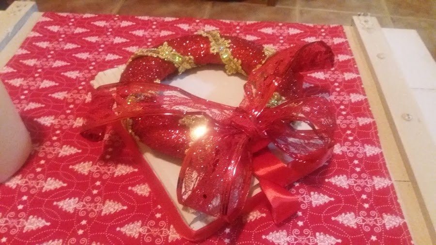 De las navidades pasadas, tenía una corona, de corcho blanco, y de este año me había sobrado cinta roja con purpurina, la rodeé, por toda la corona, y la fui pegando con silicona caliente y estirando bien para que quede sin bolsas.