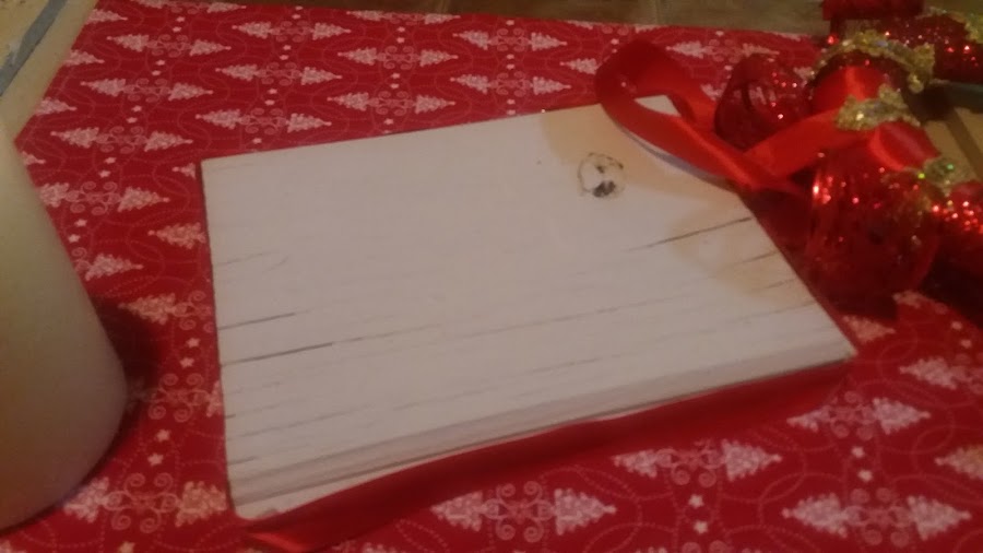 Esta tablilla la tenía en el sótono de casa, la pinté en blanco roto, sin saber que íbamos a hacer, ella nunca me cuenta nada, la dejé secar, en media hora estaba sequita.