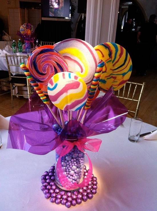 Los bombones, malvaviscos en colores y los chupetines figuran entre los dulces más demandados para hacer este tipo de adornos para mesas. Pero cada uno de nosotros puede usar su imaginación para adornar su fiesta con los dulces que más se relacionen y combinen con el tema de la misma.
