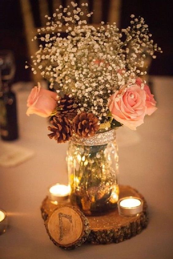 Si hacemos una remezcla de las dos ideas anteriores, este sería el resultante, un centro de mesa romántico reutilizando un bote de cristal, apoyado sobre una tabla de madera. Dá un toque romántico a la mesa añadiendo unas velas, y este será el complemento ideal para tu mesa.