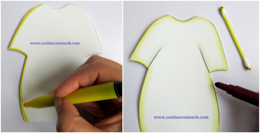 2.- La túnica del angelito lo decoramos con plumón amarillo, delineo en todo el contorno luego con plumón marrón y difumino con hisopo.