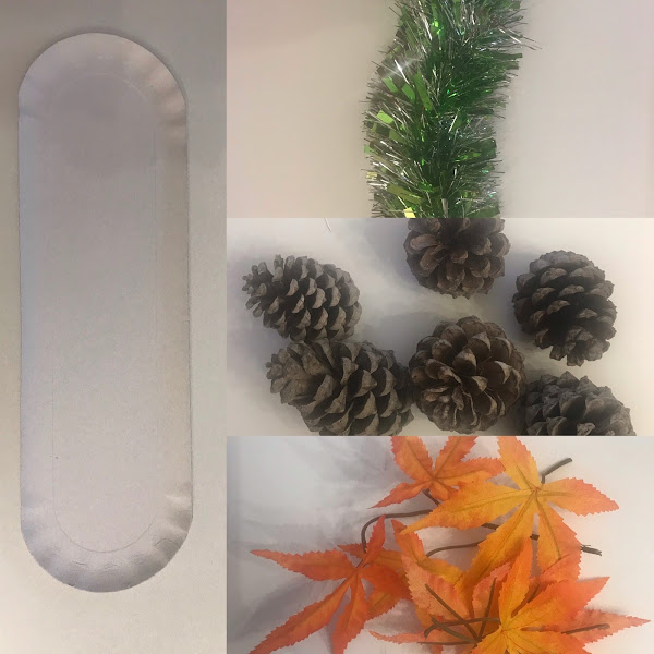 Unas bandejas de cartón de algún rico dulce de pastelería que tenia guardadas, una tira de espumillón que he cortado en cuatro trozos a la medida de cada bandeja, unas piñas grandes que he cogido en el campo en mis paseos, y unas hojas que recogí porque me gustaron sin saber que hacer con ellas y que he decidido utilizar.