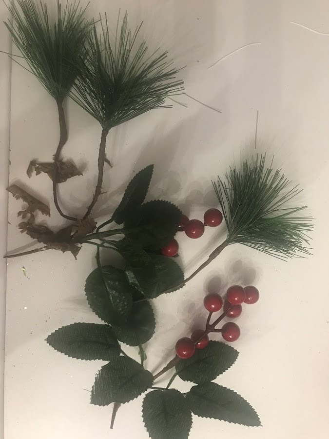 Las hojas plateadas una rama guardada de ni se cuanto tiempo que apareció haciendo limpieza en esta casa y también otra verde con bolitas rojas.