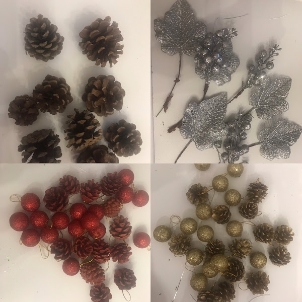 Para estos centros de Navidad, reciclo cosas que tenia guardadas por casa y otras recogidas del campo