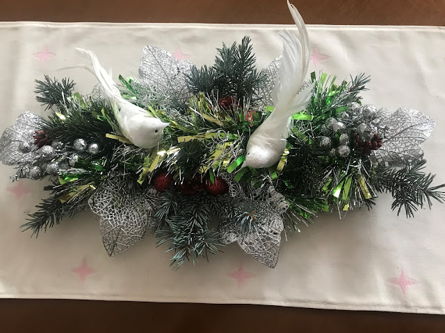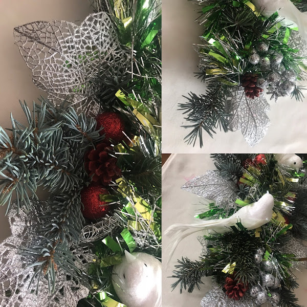 hoy os enseño el mío(el próximo jueves los otros tres) que aquí podéis ver algunos trozos y le he añadido unas estrellas que tenia, dos pajaritos que he comprado y unas ramas del pino azul que tengo en el jardín