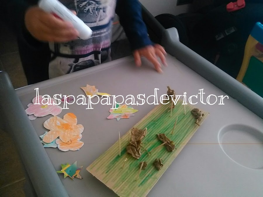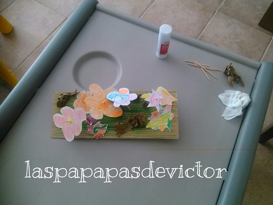 Introducir en el otro extremo las florecillas y si tenéis a mano con barra de pegamento y papel de seda pegarlo a modo de volumen