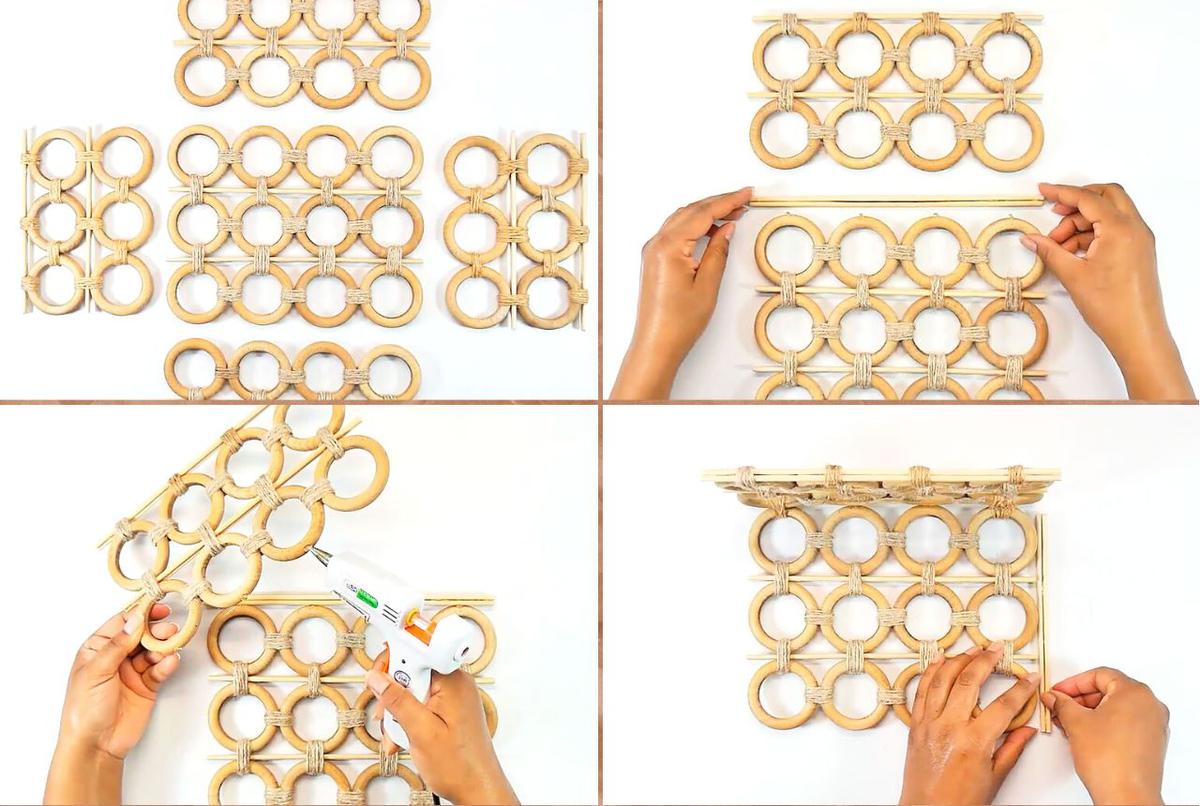 Unir una hilera de aros, un par de palitos a otra sección igual, fijar la unión con cuerda se yute y silicona caliente.