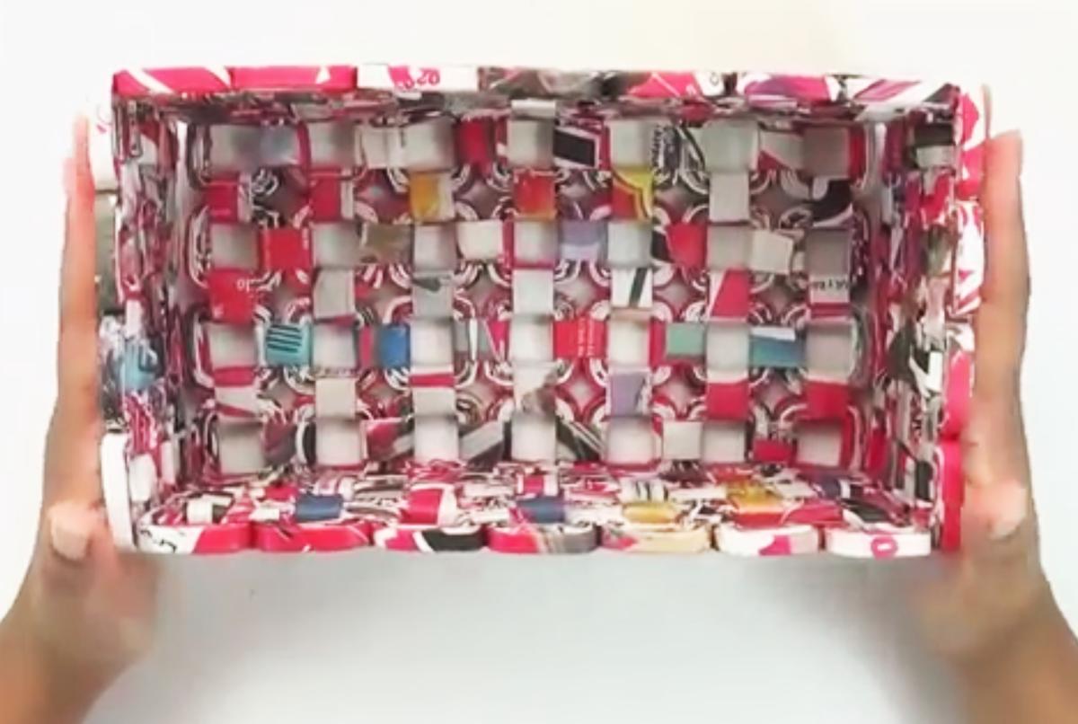 Cesta hecha con papel periódico, puedes usar papel de cuadernos, revistas o papel bond ya usado.