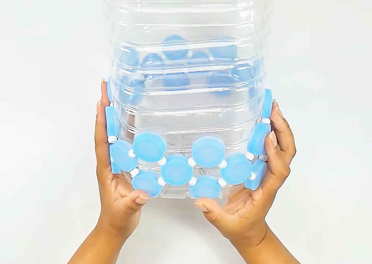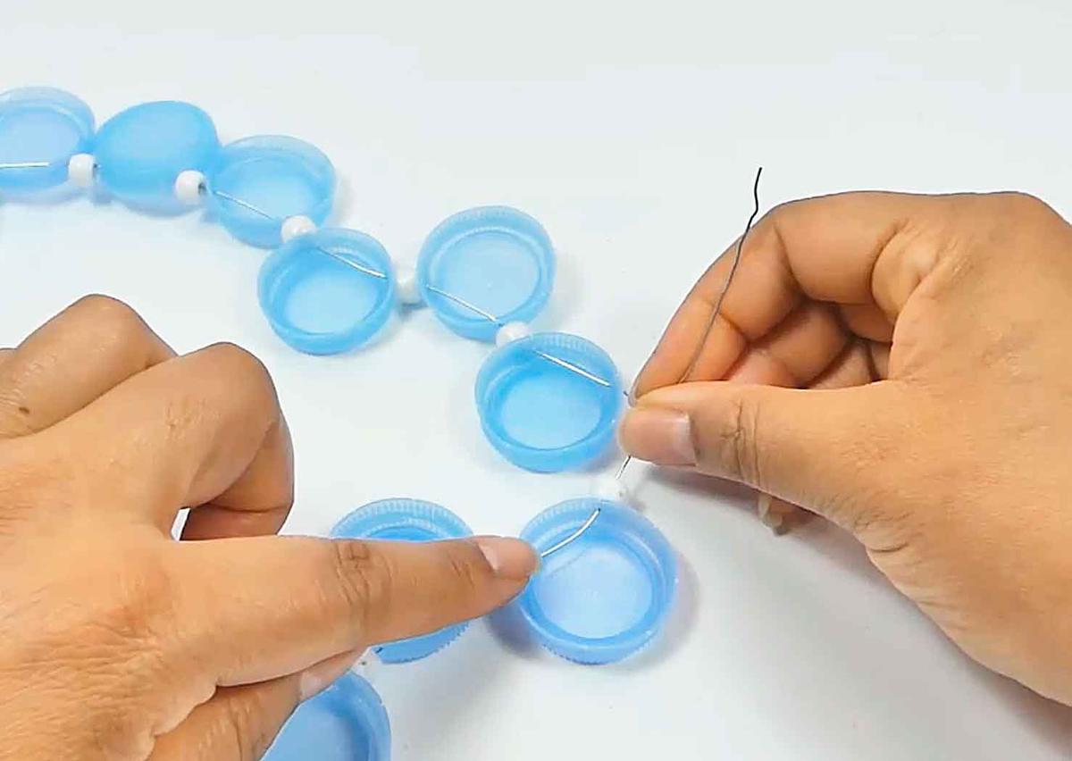 Una vez que tienes el número de tapas necesario para cubrir el garrafón de plástico, unir la primera tapa con la última, no olvides añadir la cuenta entre ellas.
