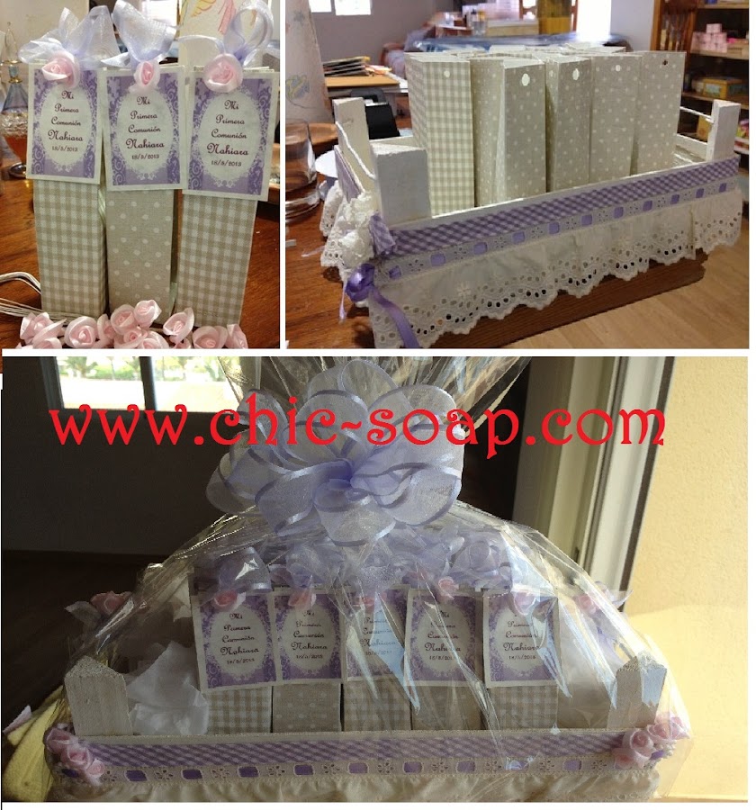 Esta semana fue muy atareada y no he podido preparar un post de jabones ya que estoy con los preparativos de varias comuniones. El trabajo que les presento es algo muy especial. La hija de mi amiga Johana hace la comunión en pocos días y le he preparado una cesta con sus detalles en color lila y beige. Todo esta hecho por mi, menos las cajitas que son compradas. Me ha encantado como ha quedado y espero que os guste.