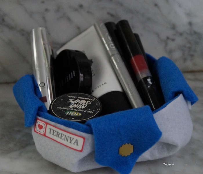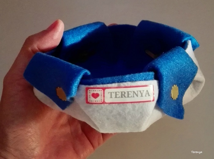 La manera de hacer es la de una caja de estrella de origami, pero en vez de papel la he hecho con fieltro y he unido las puntas de las estrellas con encuadernadores para que no se nos desmonte.