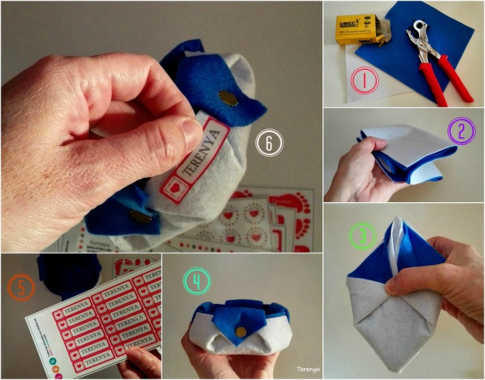 Das la vuelta al fieltro y haces el mismo proceso pero doblando por la mitad. Cerramos la figura doblando las 2 puntas hacia adentro como muestro en la fotografía (2) y lo planchamos para que se nos mantenga.