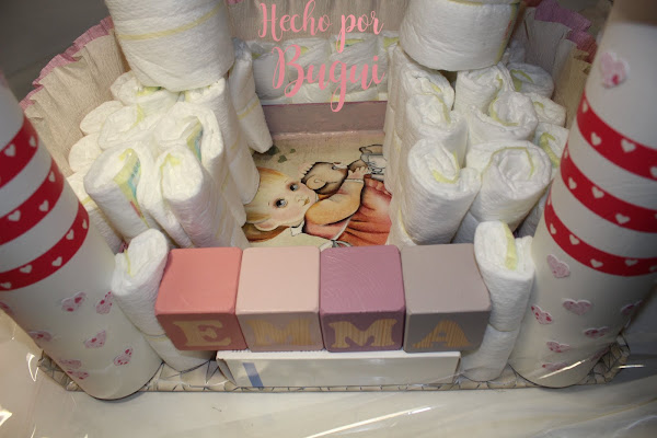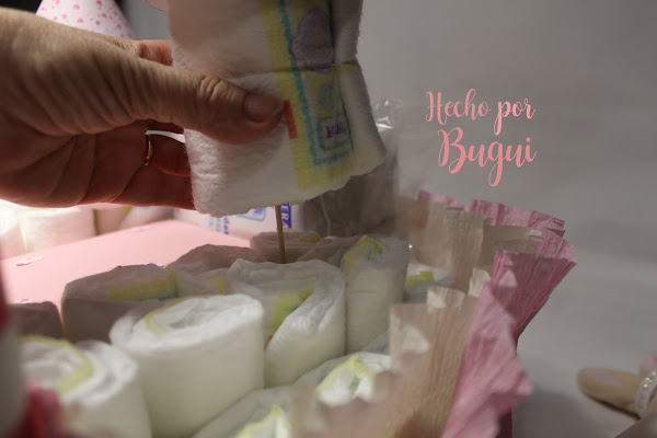 Las torres de detrás son pañales, que llevan un palo de brocheta para sujetarlos con la capa inferior de pañales.