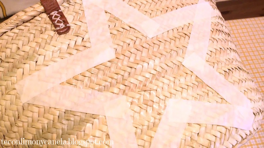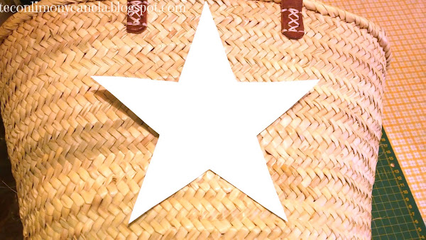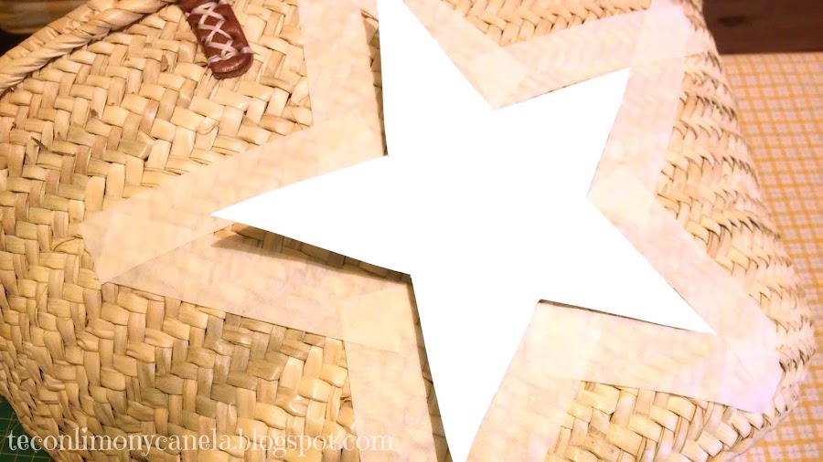 Para hacer mi platilla de estrella, busqué un plato que quedase bien en el lateral del bolso. Lo marqué sobre una cartulina y sobre ese círculo dibujé mi estrella. Se recorta y la colocamos en el lado que queramos pintar la estrella, sujeta con un poco de cinta de carrocero por detrás.