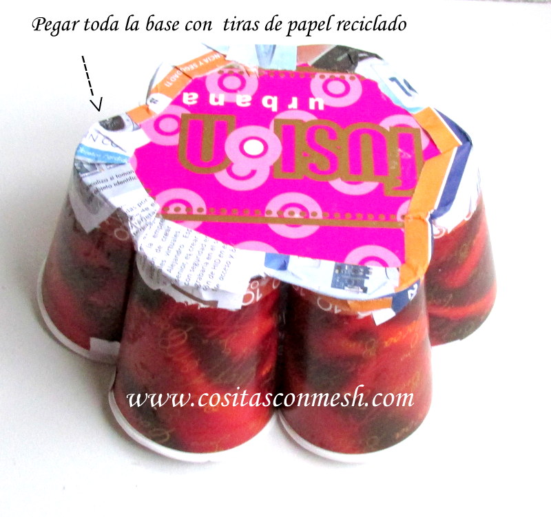 2.-Corta tiras de papel y con pegamento blanco unimos los vasos que acabamos de cortar.