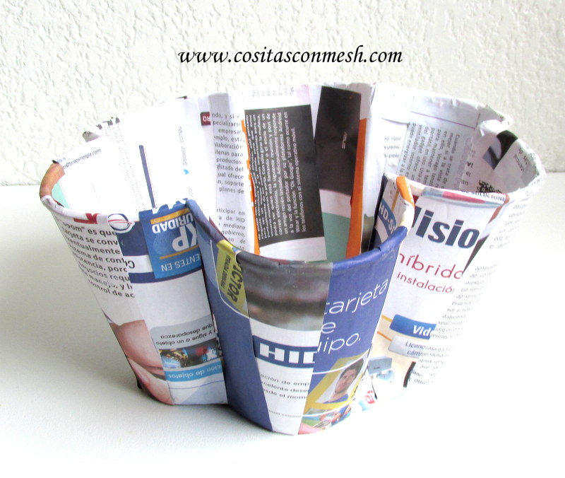 7.-Corta tiras de papel de revistas o de periódico, esto nos ayudara a reforzar la canasta.Al pegar estas tiras tanto en la parte externa como interna, quedara más resistente la canasta.Trata de que quede bien pegado el papel.