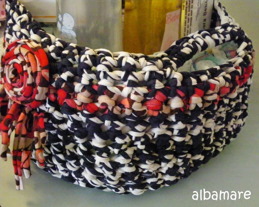 Aquí tenéis la cesta en detalle. Está confeccionada empezando con el anillo mágico y siguiendo con punto bajo. Le hemos añadido dos filas de trapillo de otro color, unas asas y una flor con flecos para adornarla.