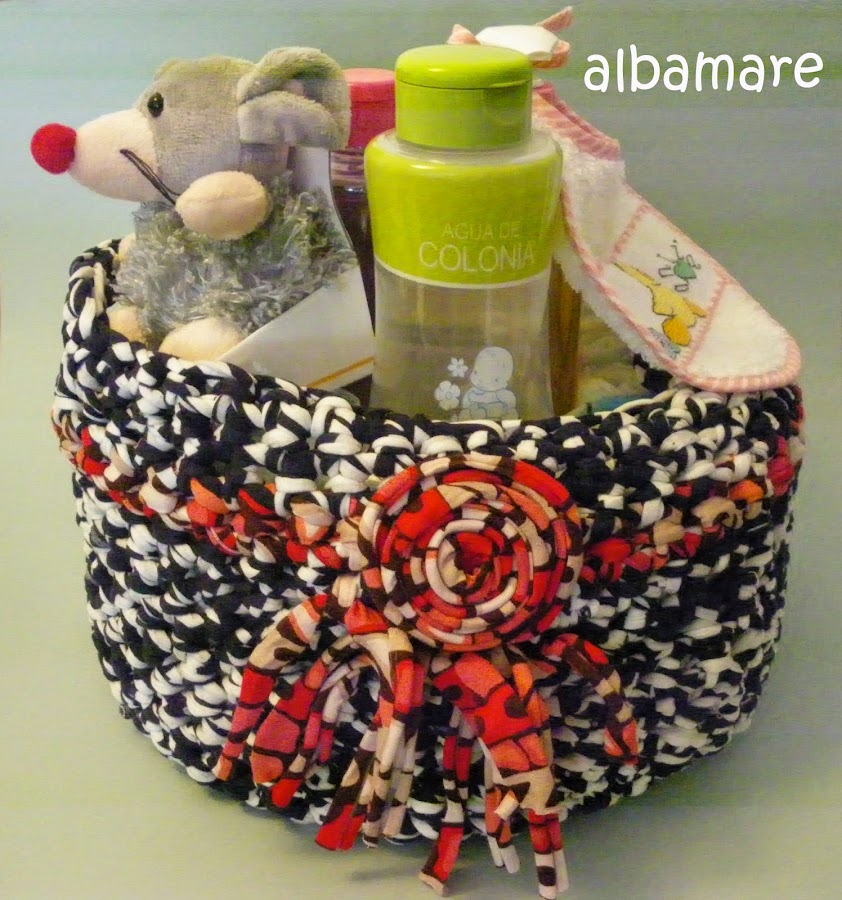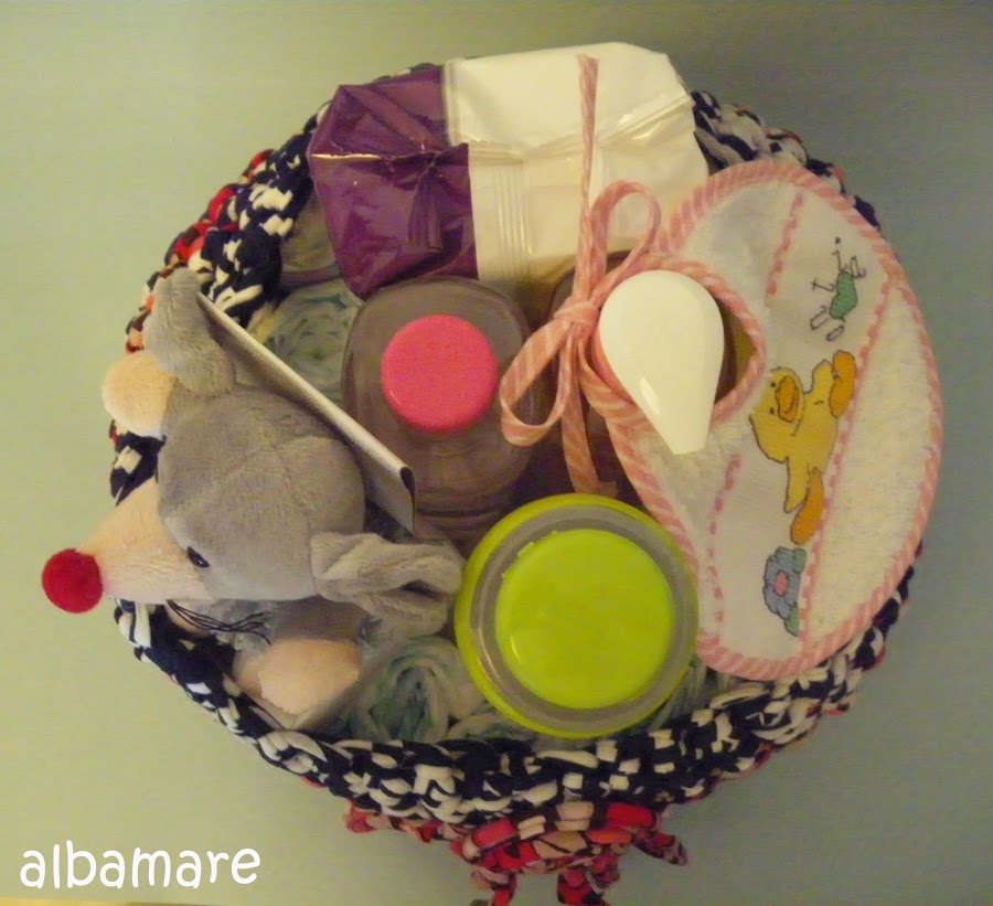 En esta ocasión he confeccionado una cesta de trapillo azul y blanco y la hemos llenado con consumibles imprescindibles para bebés.