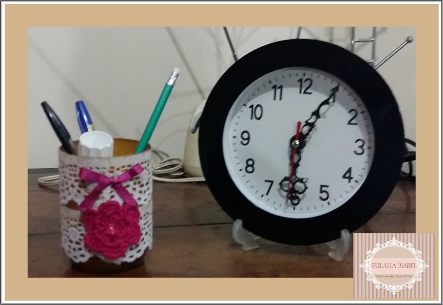 PORTA LAPICES en fondo de botella plástica, adornado con encaje, flor tejida a crochet y lazo de cinta.rosada,; para mi taller .