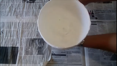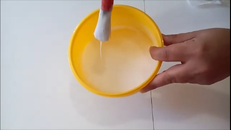 Hacemos una mezcla en el recipiente de más o menos la misma cantidad de pegamento que de agua. Aunque puedes usar más pegamento que agua, la idea es diluir un poco el pegamento.