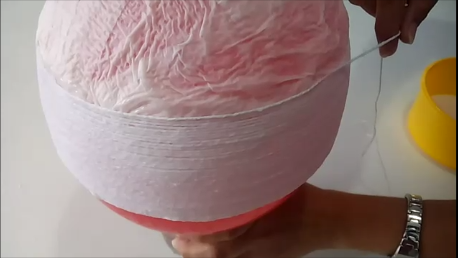 Ahora, tomamos el cordón y vamos a enrollarlo alrededor del globo y encima del papel que ya hemos pegado, a la vez que lo vamos humedeciendo con el dedo. Empezamos desde lo que va a ser el borde de la cesta. Puedes enrollarlo como más te guste pero en mi caso lo voy a hacer dando una vuelta tras otra en forma circular y en orden de manera que quede un línea de cordón debajo de la otra, de ésta forma: