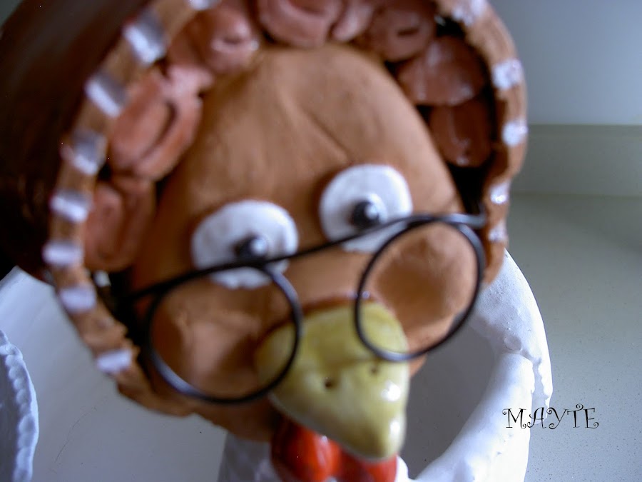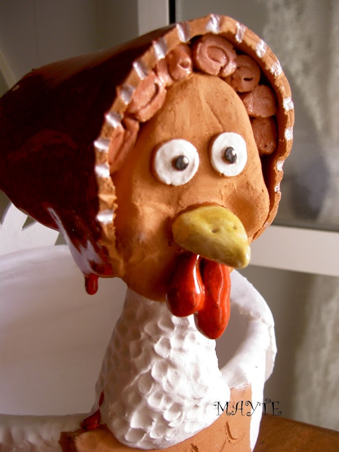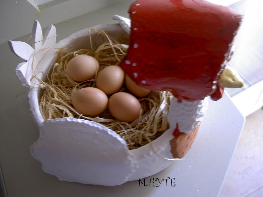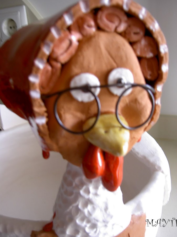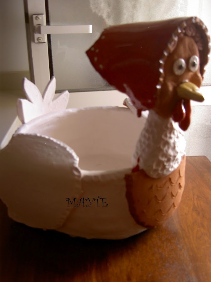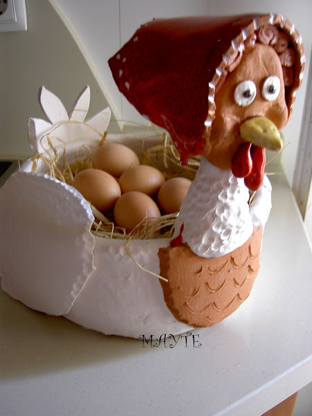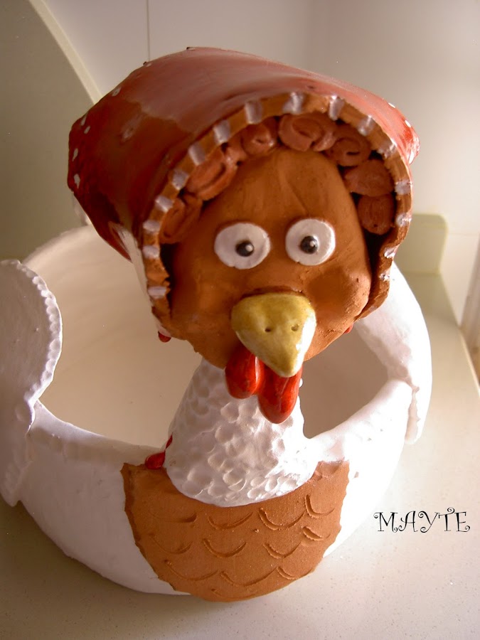 yá viejita le he colocado unas gafas...me inspiré en las cestas de mimbre con gallina haciendo punto de fieltro..jajjaj para que no penseis que he perdido la cabeza con tanta gallina