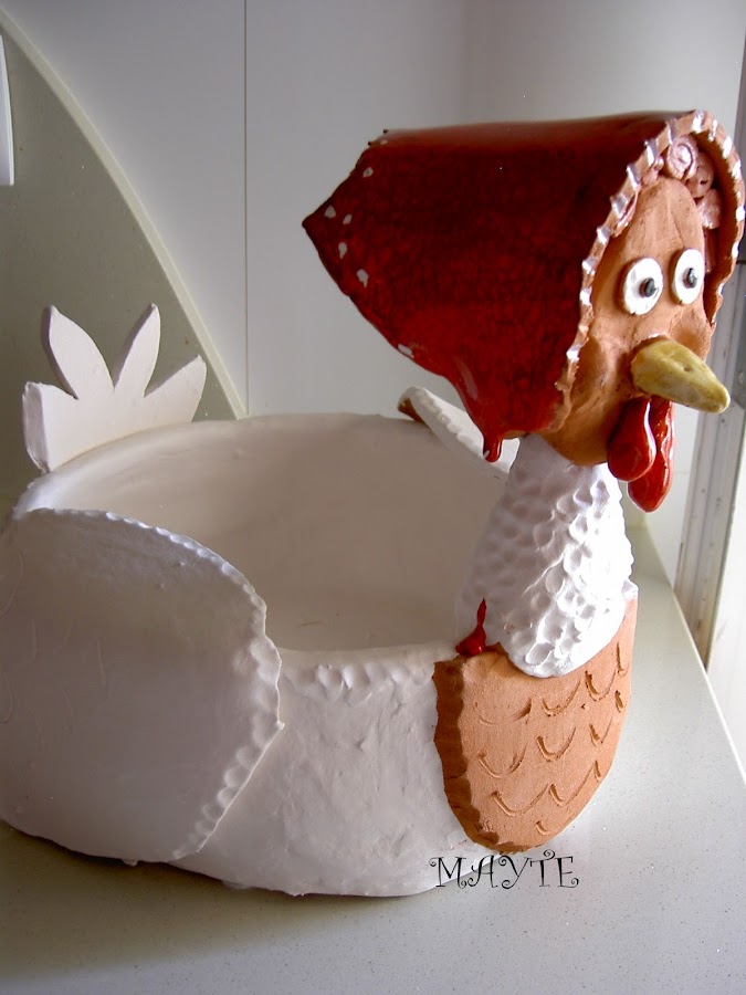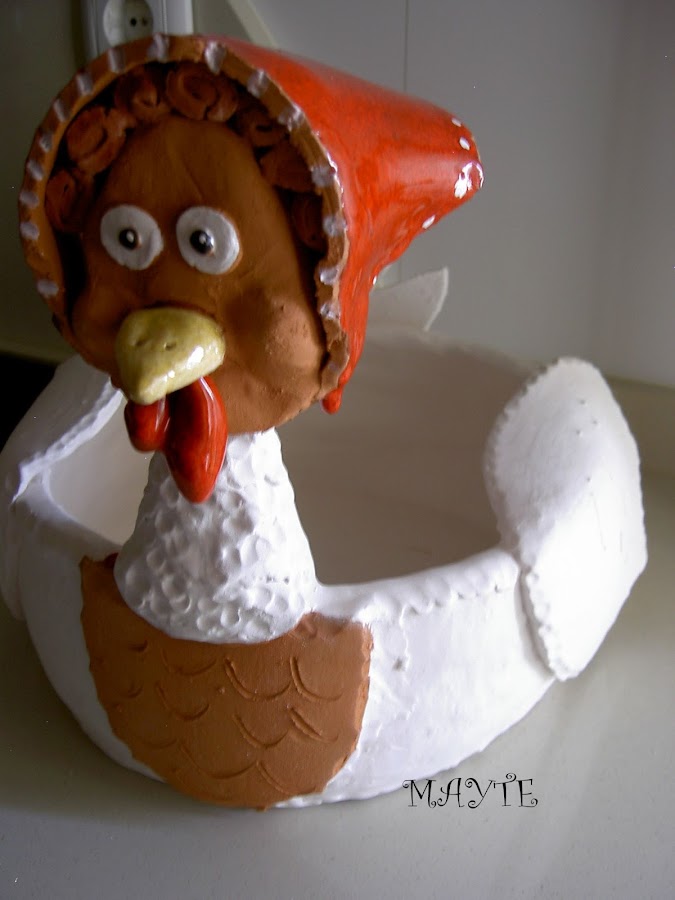 Una gallina muy campestre, está abierta por detras para guardar bolsas o lo que quierás. te dejo los patrones por si te animas.