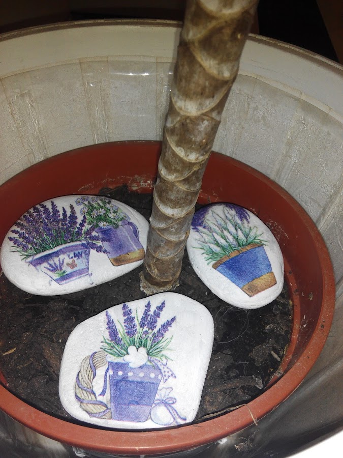 Pensando, pensando, me decidí por una piedras de la playa que siempre tengo puestas en las macetas. En esta zona es famoso el viento de levante, que sopla bastante fuerte cuando quiere (que es casi siempre) y se lleva la arena de las macetas en un pis pas. Así que yo le pongo piedras de la playa, planitas, para evitar esto y para ayudarles a conservar la humedad (ea!! super truco!!!)